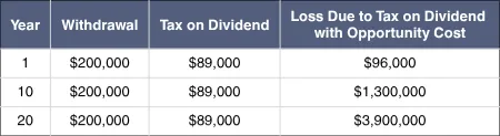 Assume Dr. Client needs $200,000 after tax annually. With a personal tax rate around 40 percent, the corporation may need to distribute about $330,000 annually, creating about $130,000 of tax each year under the dividend taxation rules in ITA s.82 and s.121. Over 30 years of retirement, annual tax may be about $130,000, resulting in total tax of approximately $3.9 million.