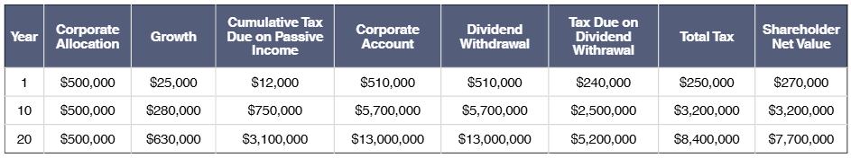 In year 1, the shareholder may receive about $270,000 after tax, while paying approximately $12,000 in passive income tax and $240,000 in dividend tax. By year 10, the after tax value may reach about $3.2 million, with roughly $140,000 paid in passive income tax and $3.2 million in dividend tax. By year 20, the shareholder may receive about $7.7 million after tax, while total taxes paid may reach approximately $8.4 million. As capital grows, tax leakage grows with it.